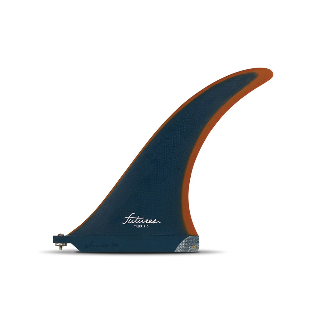 Futures Tiller 9" Fibreglass Fin features a large base for hold, and a thinned tip for added responsiveness from rail to rail. The Tiller is a great template for mid-length boards, longboards, as well as boards with 2 + 1 fin configurations. This timeless flex fin is available in 8”, 9” and 10”.